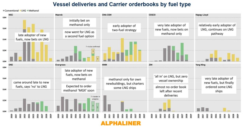 This chart perfectly visualizes the strategic shift to a dual-fuel model, showing how LNG-fueled vessels are added to the order book from 2026, complementing the earlier methanol-only strategy.
